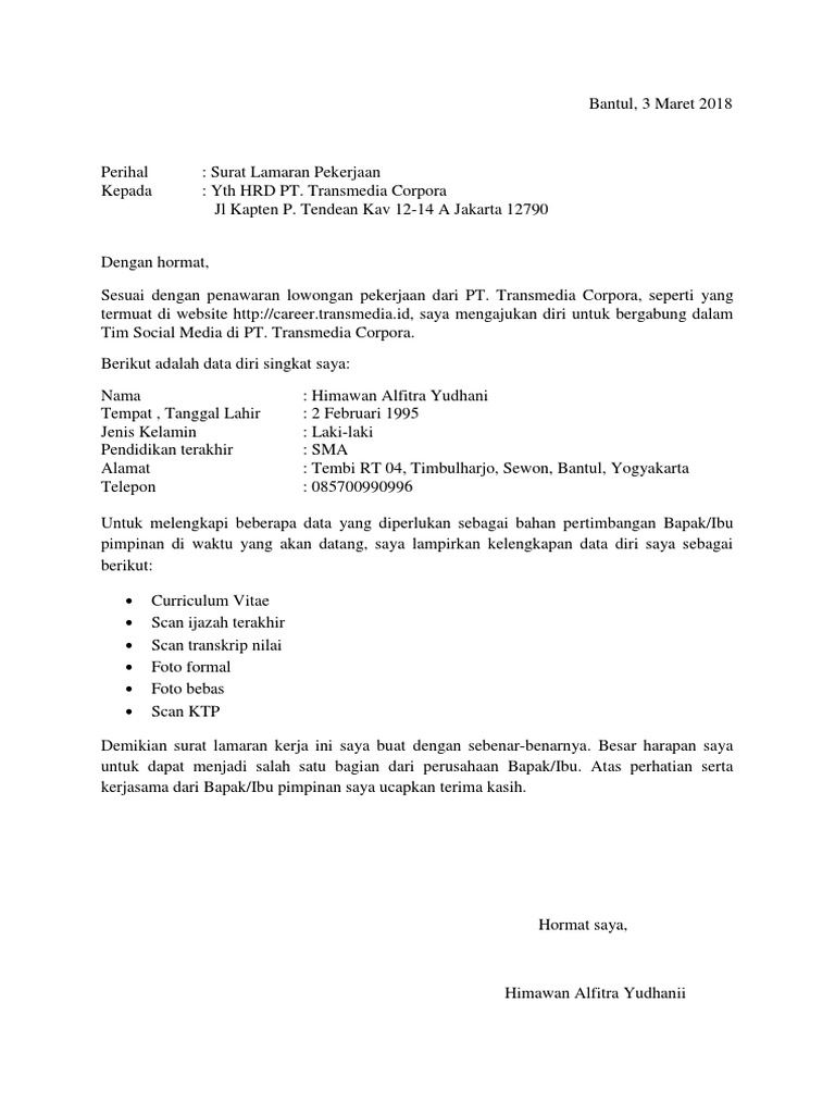 Contoh surat lamaran kerja umum, bank, karyawan, alfamart, pt, sekolahan, formal, fresh graduate, bahasa inggris, via email, tulis surat lamaran kerja adalah surat yang digunakan untuk melakukan permohonan mendapatkan pekerjaan sesuai pengalaman pada perusahaan tertentu.